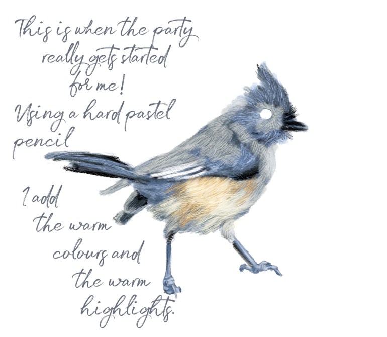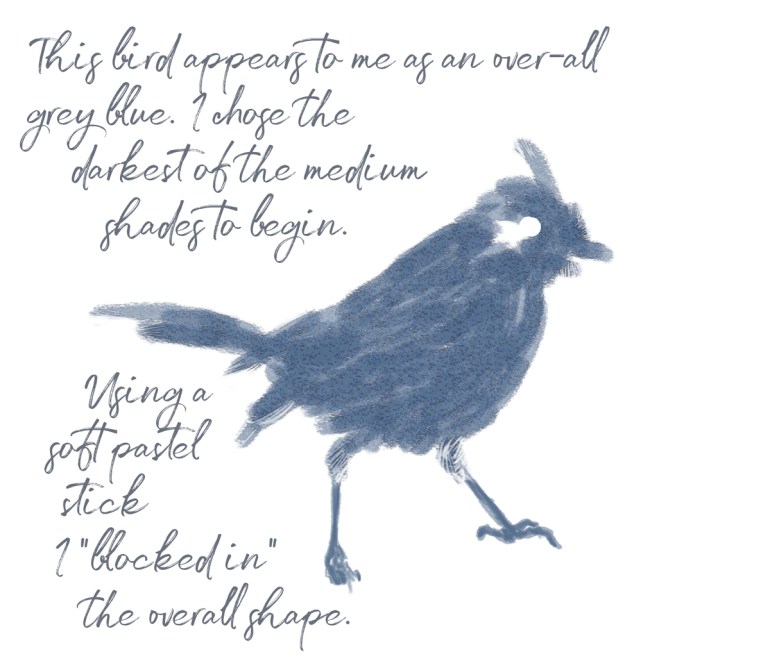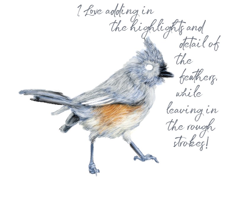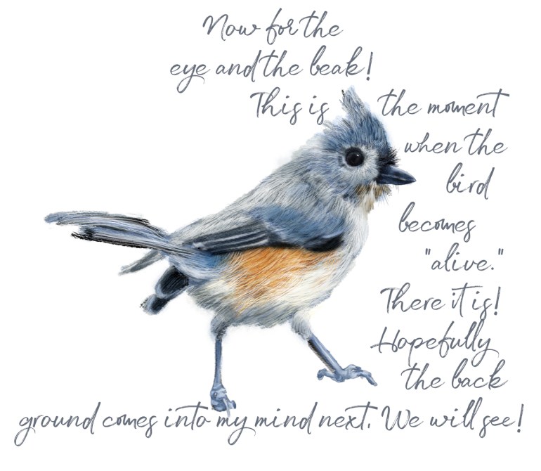 I saw an image of a Tufted Titmouse. Gotta love that name, and there it was, “me, me, draw me!” So I have. I sort of have an inkling of a bigger picture, and hopefully that will be arriving into my imagination soon. For now, I drew the Tufted Titmouse and hopefully these stages will be of interest. We all work differently, and I have learned a great deal from others, so this is “Share and Tell” time. Let me know!