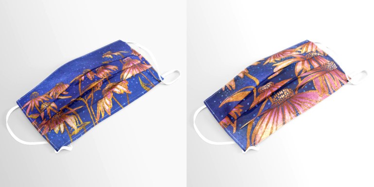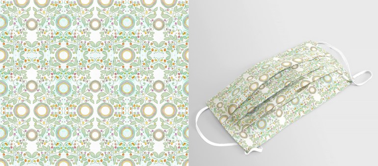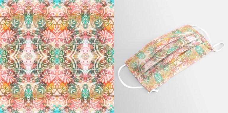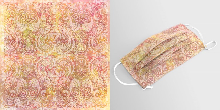 This week as I continued to create art for face masks, I decided to experiment with combining three styles I adore; Batik, Wood Block, and Tiffany Glass. Above, is my first first experimental painting using this combination. Then I painted it again, expanded the design, and began developing the “copper foil” appearance between each piece. The copper foil method of stained glass construction involves wrapping the edges of each piece of glass with a copper foil tape, then joining them by soldering them together.