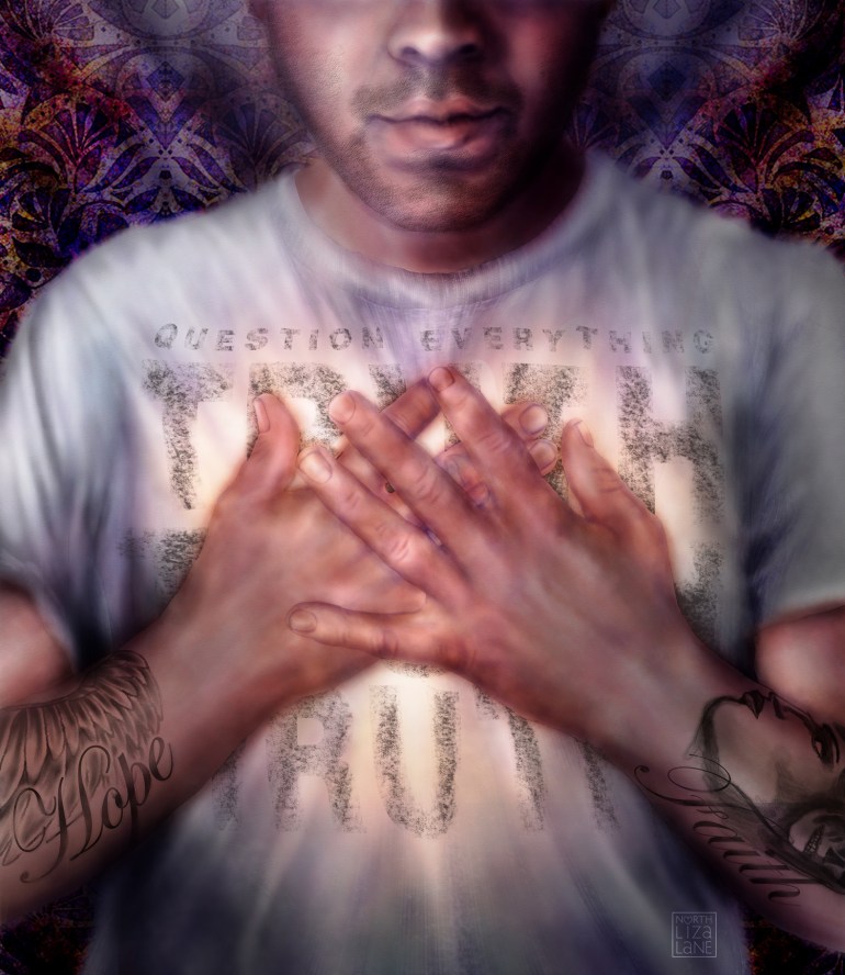 I continued to paint this young man, who is cherishing the light and the knowingness within his heart. I began to understand the symbolism, the adventure, the message, and the painting itself. We all have the truth available and running through us in each moment. Accessing this truth, and the choice to honor and cherish this truth is ours, and requires the courage of a personal change. We also have the choice to see only with our eyes, feel only our emotional reactions in a situation, or be mislead by the opinions of others. However, these perceptions are not the whole truth.