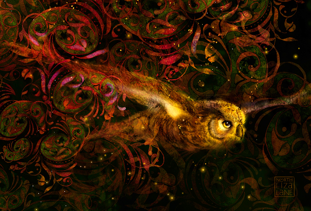“Night Owl” 24″ x 30.” Messengers of information from the unknown, to the known. From out of darkness is light, out of the night is the day.