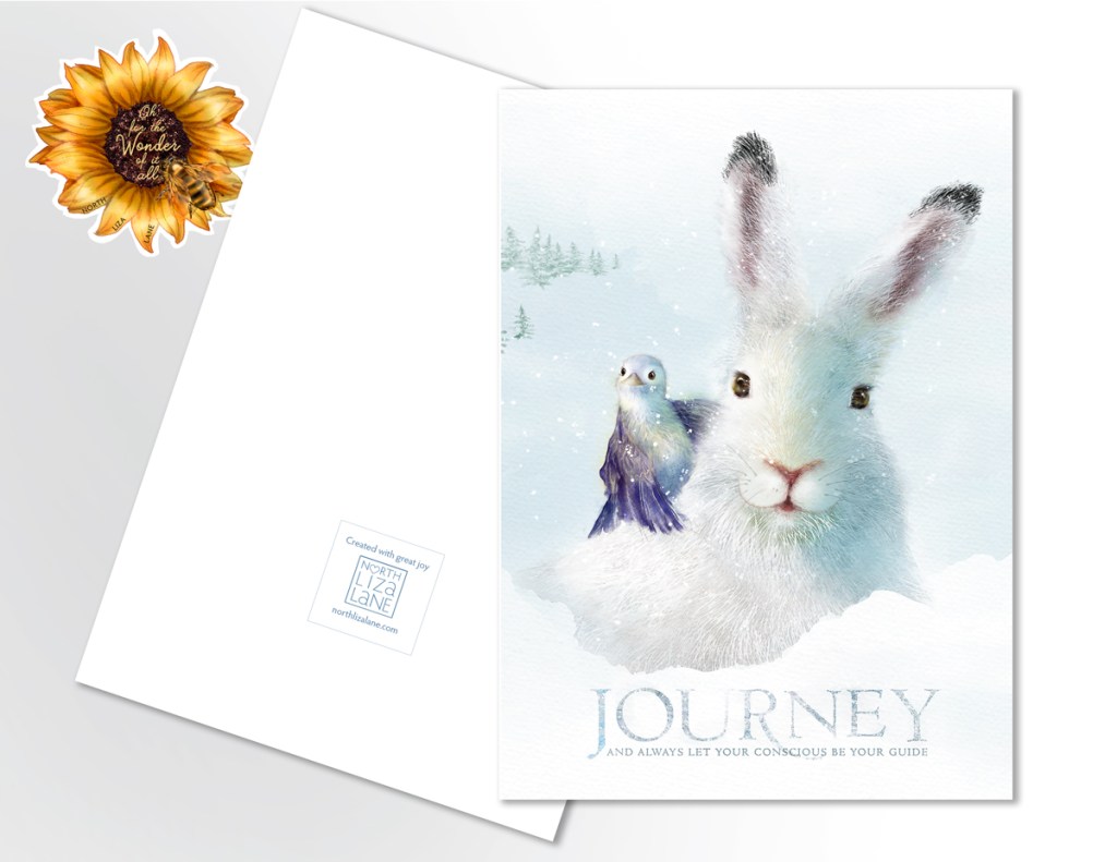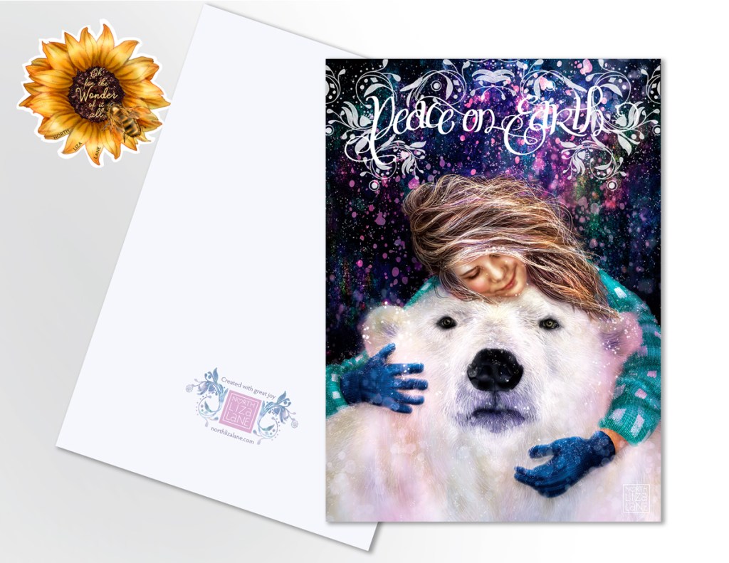Each art card is printed on archival 130# stock, a wonderful heavy, and rich quality to the touch. Available in packages of 5 fold-over greeting cards (5″x7″) with natural brown fiber heavy paper envelopes.